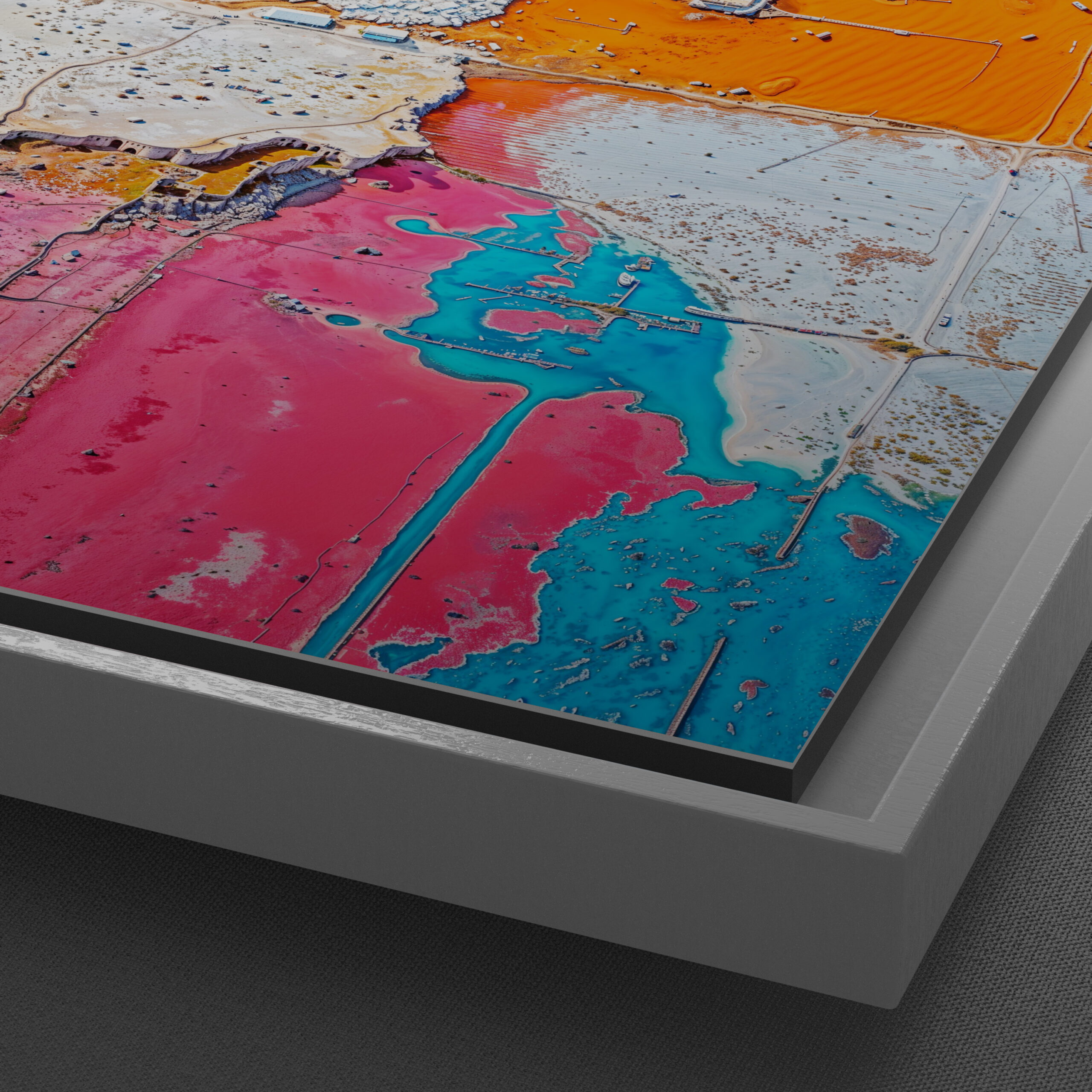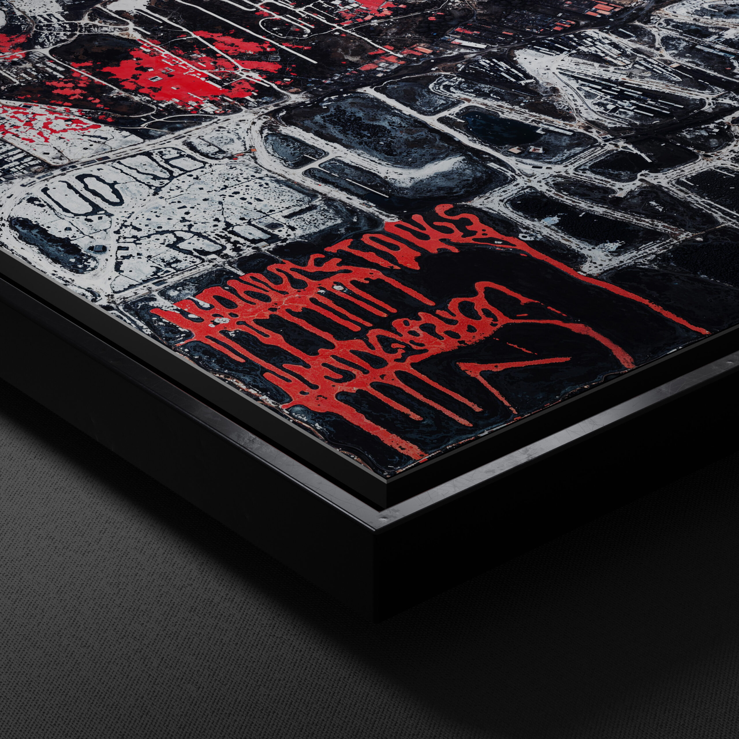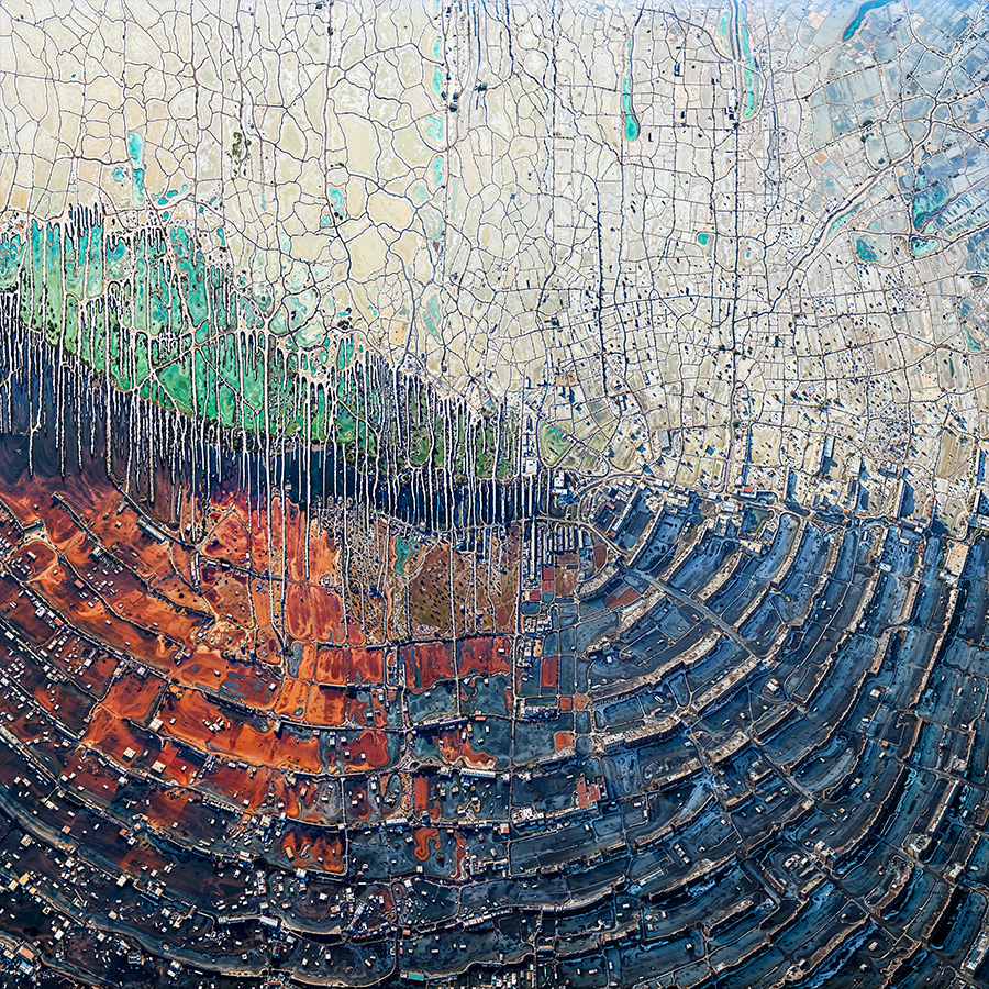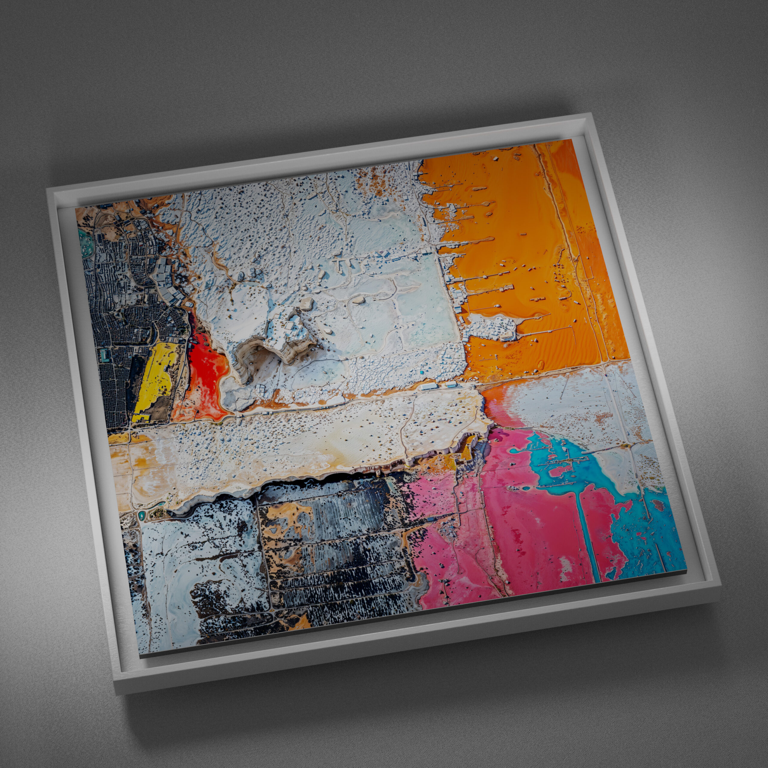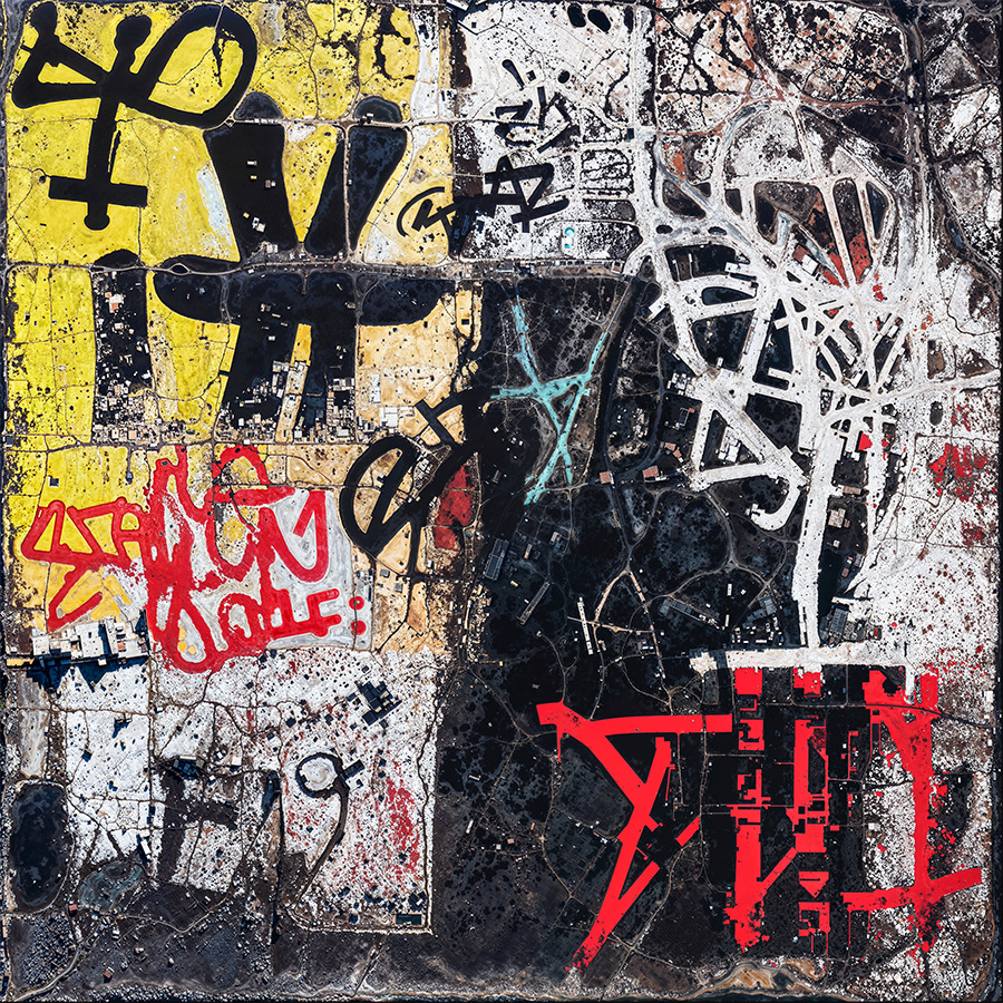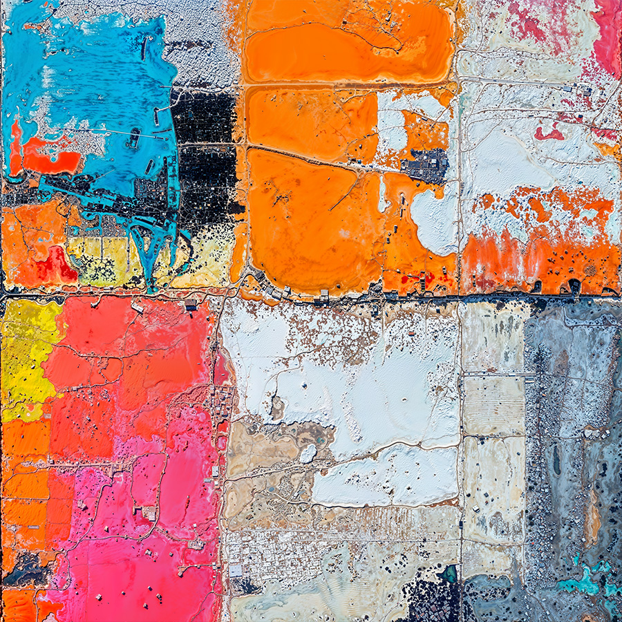 Mon processus de création commence dans la rue, où je capture des détails texturés issus de murs graphés, tagués ou marqués par le temps. Ces fragments, souvent bruts et anodins, deviennent la base de ma réflexion artistique. Grâce à un travail minutieux de transformation, mêlant photographie numérique, retouche d’image et intelligence artificielle, je réinvente ces textures pour révéler des paysages vus du ciel.