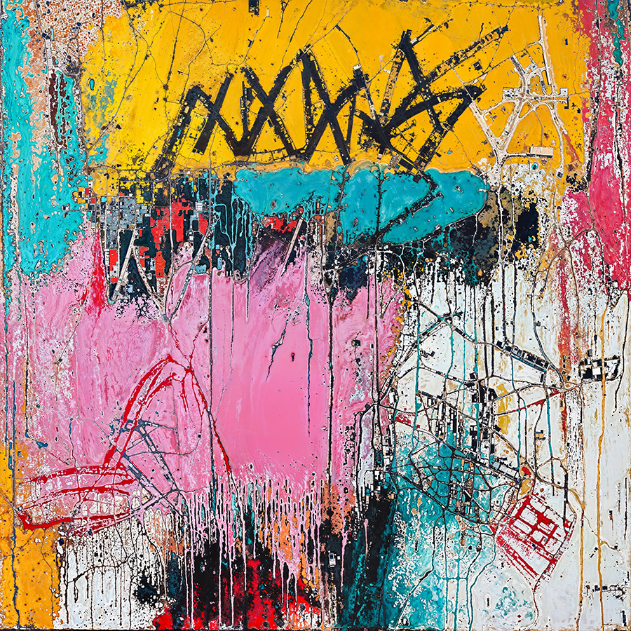 De loin, mes œuvres évoquent des murs urbains réalistes ; de près, elles révèlent des paysages vus du ciel. L’intelligence artificielle est au cœur de ce processus, amplifiant ma capacité à réinventer le réel et à fusionner l’art brut du street avec des compositions numériques sophistiquées.